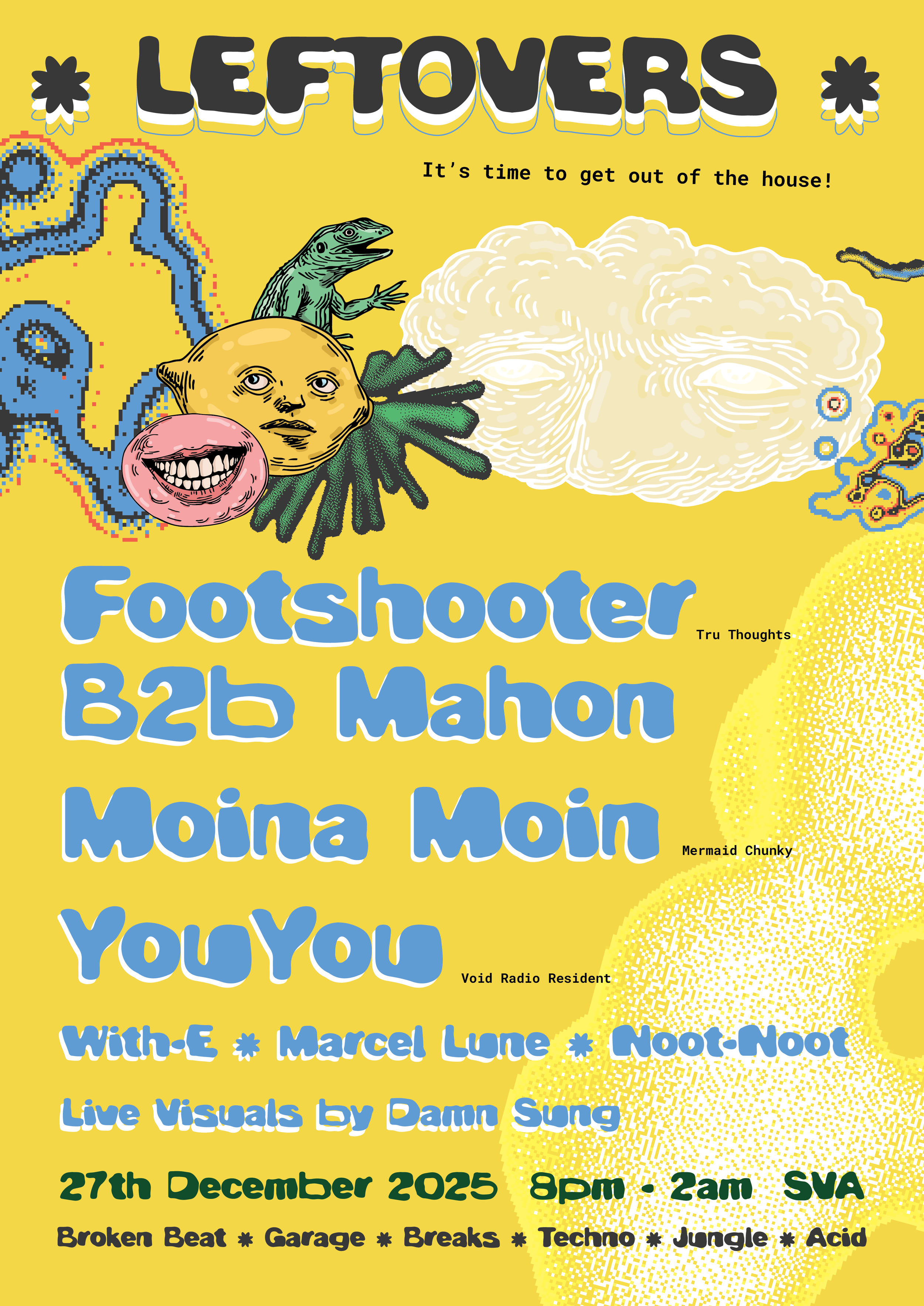 Survived Christmas? Feeling like the walls of your house are closing in? Not quite sure what day it is? Footshooter (Tru Thoughts), Moina Moin (Mermaid Chunky), Marcel Lune, WITH-E and more are here to save your sanity from post-Xmas purgatory. Ditch the sofa, shake off the slump, we’re throwing everything but the kitchen sink at the decks: Broken Beat, Techno, Soul, Garage, Breaks, Jazz and so much more... Seriously, don't ask, just come and dance. You deserve this.